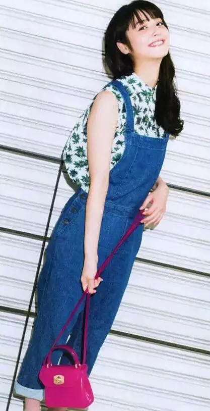印花图案无袖翻领衬衫 蓝色宽松收腰背带牛仔裤 粉色单肩斜跨果冻包
