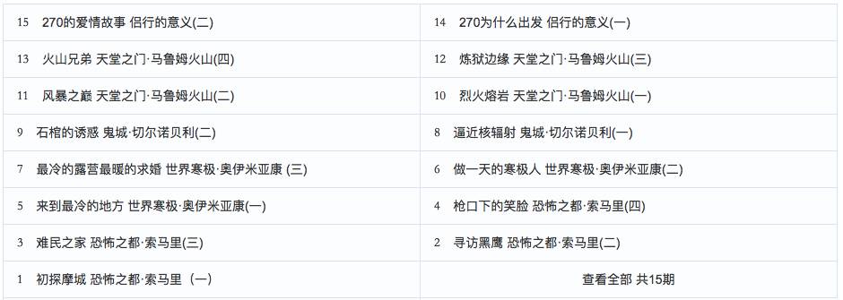 这是第一季《侣行》的节目列表,看起来他们真的很“作”,在世界上最冷的地方——奥伊米亚康求婚;到枪声四起的索马里去寻找电影里真实的战斗场景;去切尔诺贝利体验核辐射的威胁,到马鲁姆火山打开天堂之门……