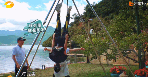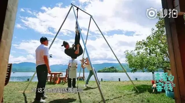在亲爱的客栈里,刘涛玩空中倒立,用力往上这么一窜,两腿就翻立起来,右腿搭住吊环右边的绳带,左脚搭住吊环左边的绳带,就完成一个完美的吊环倒立。