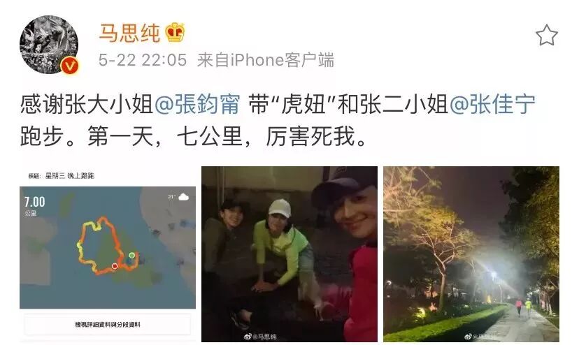 马思纯也在微博爆料过,被张钧甯抓去跑步。第一天就跑了7公里。