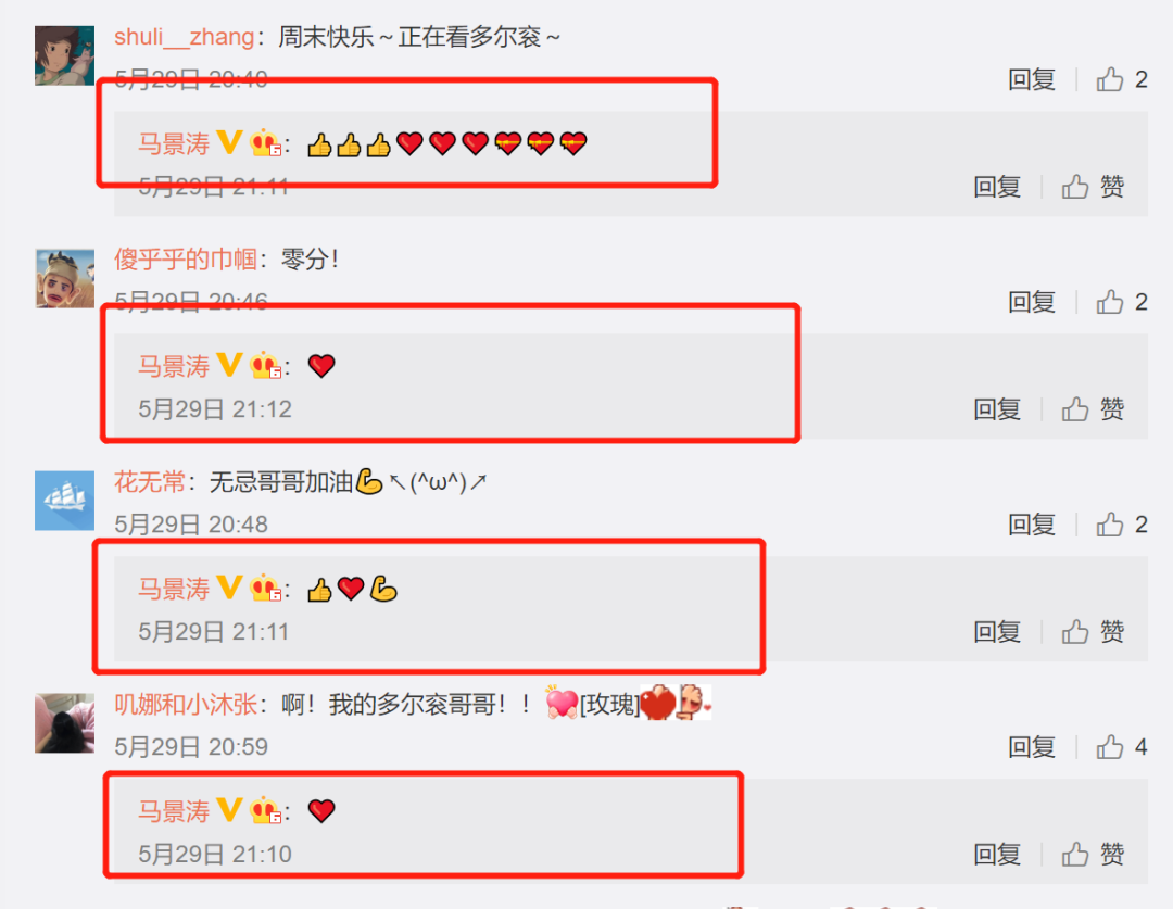 细心看,马景涛会给每一个留言的动态都给予回复,这样宠粉也是没谁了!