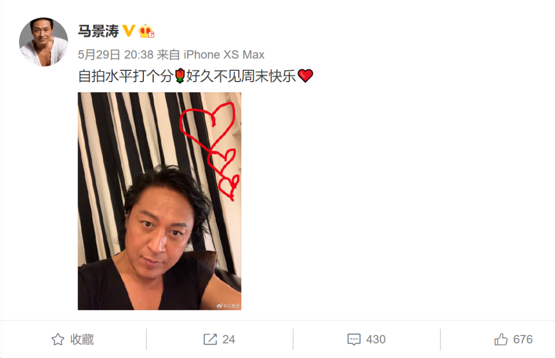 许久没有露面的“咆哮帝”马景涛,近日在自己的社交平台更新了自己的自拍。并且送上祝福:周末快乐!