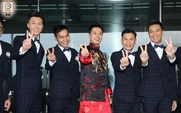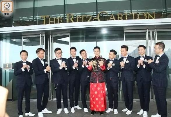 伙同九位兄弟团在酒店门口让记者大合照,个个都摆出V字手势,信心十足稍后去接新娘!