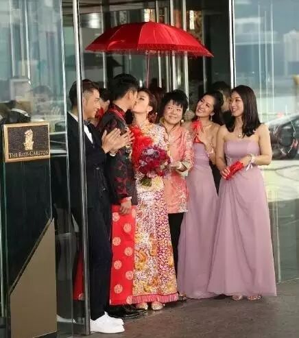一对新人在兄弟姊妹团边夹道欢迎边洒红豆下,双双步出酒店见人,当中亦有大妗姐撑红伞陪同二人现身。