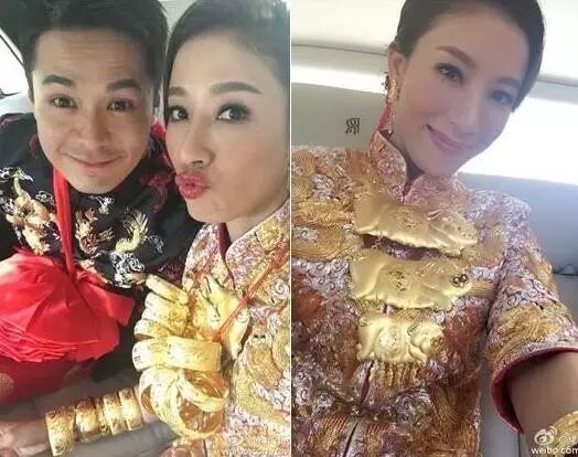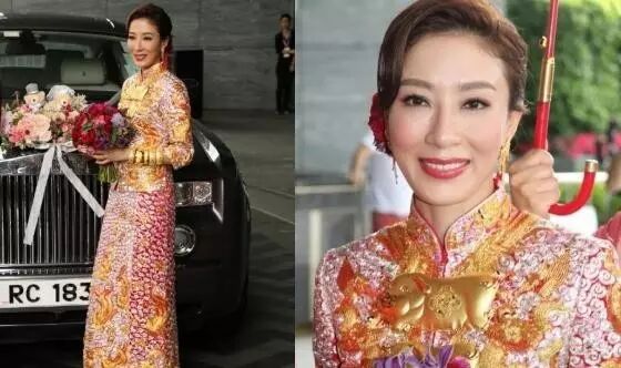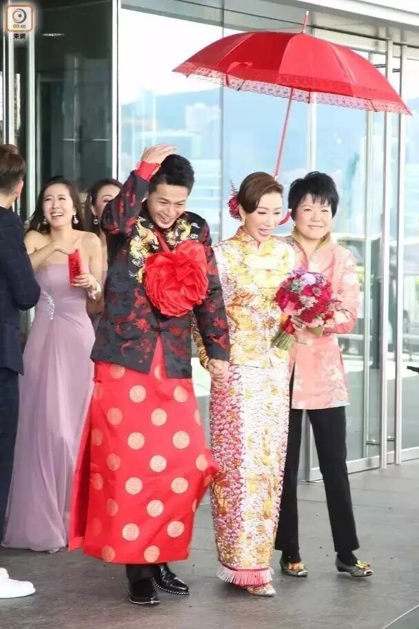 大概过了一小时约十点四十五分,新娘杨怡终于被迎出来啦。杨怡一身红配金色中式礼服简直抢爆镜!杨怡和传媒打招呼时,见到她心口挂着老友马浚伟送的金猪,左右手共戴上五对龙凤镯及金戒子,贵气十足!