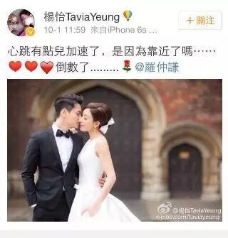 适逢国庆假期,普天同庆之际,香港娱乐圈又迎来另一件喜庆之事!今日杨怡与罗仲谦的大喜之日,一对新人今日于香港九龙的Ritz-Carlton酒店延开50席招呼亲朋戚友举办婚礼,阵容相当强大!