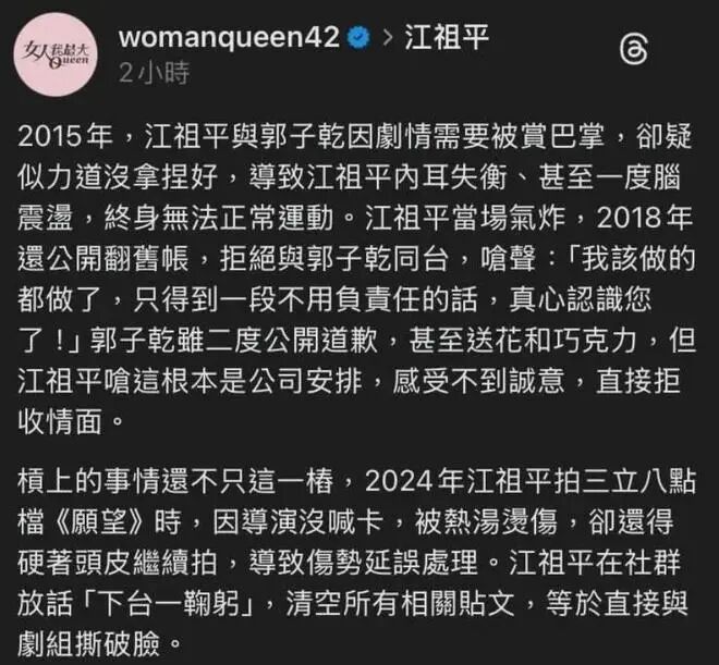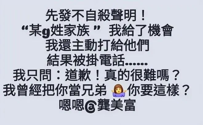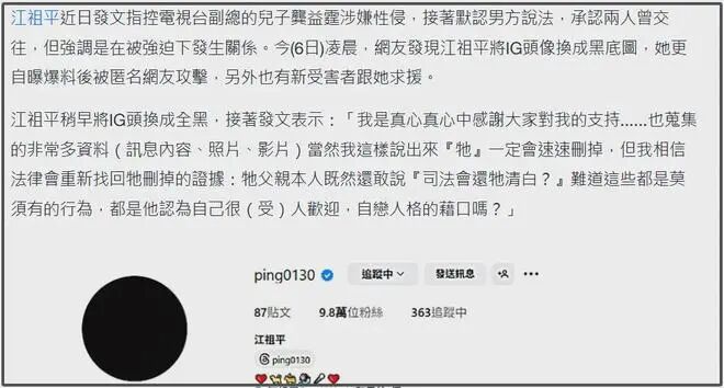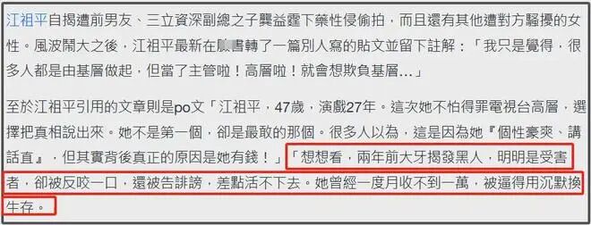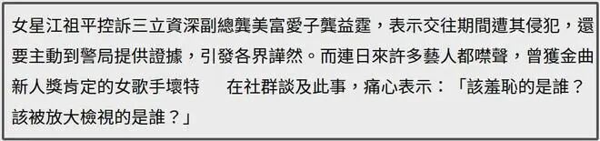 江祖平遭性侵事件后续!女方被捂嘴,男方家中势力大无明星敢发声 策划总舵 港台女星 2025-09-06 15:03:48 95 创作不易,用心坚持,欢迎请BaGua喝几杯爱心咖啡!打赏并支持本文 打赏并删除本文 台湾省娱乐圈近日再掀波澜,47岁女星江祖平勇敢揭露自己遭受电视台高层之子性侵的骇人听闻事件。她连续多日发出超过50条动态,坚定控诉加害者。直至她公开男方身份背景并发表不自杀声明,媒体才开始深入追踪报道,引发社会广泛关注。江祖平的勇敢发声,不仅是对自身遭遇的抗争,更是对整个娱乐圈性侵问题的有力控诉。江祖平公开宣布要让对方在他灵堂前跪地忏悔,表明他已经做好了不惜一切代价的准备。他的话语中透露出一种破釜沉舟的勇气。随着舆论的不断升温,男方终于打破沉默,公开回应了这一指控。他坚决否认了性侵江祖平的指控,并透露两人曾有过一段恋情。在回应中,他暗示江祖平情绪波动较大,质疑其动机。他提到,两人在8月分手,仅仅一个月后,江祖平就提出了性侵的指控。这一事件的真相究竟如何,仍待进一步调查。当然,未经调查不得轻易定罪,理论上每个人都应被视为无辜。目前,江祖平已经提交了短信截图、录音和家中被破坏的照片作为证据。然而,他尚未提供对方涉嫌更换女方心脏病药物为镇定剂、下药并偷拍的直接证据。警方已与江祖平取得联系,按照常理,接下来的事宜将交由法律程序来定夺。紧接着,那句老生常谈的“不出意外的话就要出意外了”应验了。江祖平突然被一只大手捂住了嘴巴。龚益霆,一个在台湾省媒体界颇具影响力的人物,他的身份背景既非微不足道,也非举足轻重。作为三立电视台副总龚美富的独生子,他的名字在江祖平发布不自杀声明时被特别提及,突显了其家族在台湾省传媒界的重要地位。尽管龚美富在儿子面临指控后暂时退出了公众视野,但龚家在台湾娱乐圈的影响力却不容小觑。早在多年前,当红男星王耀庆与龚美富发生争执后,便被迅速边缘化。这一事件充分展示了龚家在圈内的权势和影响力,令人不得不对这股势力刮目相看。在日常生活中,即使是微不足道的小事也能引发台湾娱乐圈的热烈讨论。然而,当江祖平勇敢揭露自己遭受性侵的真相时,那些平日里爱发表意见的圈内人士却突然陷入了沉默。这种对比鲜明的现象不禁让人深思:在面对真正的重大问题时,为何这些公众人物却选择保持沉默?这背后反映出了娱乐圈怎样的现实和无奈?敢于公开发声的明星寥寥无几,屈指可数。他们已经毫不含糊地表明了自己的立场。然而,似乎无人愿意挺身而出,勇敢地表达自己的观点。这种集体的缄默不禁让人深思:究竟是何原因让这些明星选择了沉默?在这个光鲜亮丽的舞台上,又隐藏着多少不为人知的秘密和无奈?台媒的报道倾向已显而易见。众多网友早已察觉,尽管台媒纷纷报道江祖平事件,但它们的观点却一个比一个偏颇。这种倾向性报道不禁让人质疑其公正性和客观性。要为男方打上马赛克,或者巧妙地暗示江祖平利用媒体的影响力,亦或是从某个不为人知的角落挖掘出一位律师,专门针对江祖平的不足之处进行挑剔。一夜之间,男方的背景信息仿佛被神秘的帷幕所遮蔽,鲜少为人所知。与此同时,江祖平家族的历代历史却如同被置于显微镜下,每一细节都被无情地放大和审视。《女人我最大》节目组还莫名发了个动态曝光江祖平旧事,被网友一眼看出是想给江祖平泼脏水。难得有工作人员匿名发声,曝光龚益霆爱和漂亮女生搭话,还要感慨龚家的势力比想象中要大。还好,江祖平没有放弃的意思。——她凌晨更换了黑色头像,表示对方随时会销毁证据,提到自己一发文就收到了威胁短信,透露受害者不止她一位,还转发了一则提及女星大牙的动态,态度坚定要和男方对抗到底。大牙的经历对江祖平来说,确实值得参考。女星大牙站出来控诉范玮琪丈夫陈建州骚扰,获得五位证人支持,结果因为大牙是底层小明星,得罪了陈建州,收入有限还遭到圈内软封杀,没了工作没了金钱支持,被迫放弃追究。最近,大牙经历了一场离婚风波。尽管她公开表示,分手的原因是生育问题,但根据她的婚姻时间线来看,不难发现这场婚变背后,骚扰事件的影响不容忽视。这段艰难的时期无疑给她的生活带来了不小的冲击。江祖平,愿你始终如一地守护自己的安全。从她最近的社交媒体动态来看,我们不难发现,总有一群忠实的支持者在背后默默为她加油鼓劲。越来越多网友纷纷站出来,坚决反对三立电视台的不当行为。他们坚信,正义的力量终将战胜一切不公,而事实的真相终将水落石出!这场声势浩大的抵制行动,不仅彰显了公众对真相的渴望,也展现了社会对正义的坚守。让我们拭目以待,共同见证真相大白的那一刻! 创作不易,用心坚持,欢迎请BaGua喝几杯爱心咖啡!打赏并支持本文 打赏并删除本文 感谢您的支持鼓励,我会继续努力的!文章地址:用户邮箱:打赏金额:USDT 请输入数字点击”去打赏“,即可进行打赏支持本文章哦 江祖平 发表评论
