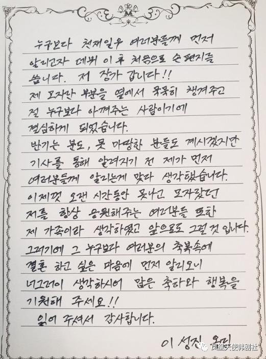不知道2月10日是什么日子,好多人都喜欢在这天官宣。韩国男团NRG原成员李成真在社交平台发布亲笔信,宣布将与交往三年的女友结婚。