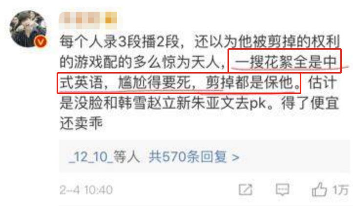 而对于他的不满,看过花絮的网友却并不买账,认为剪掉的都是他的“中式英文,尴尬得要死”、“得了便宜还卖乖”。