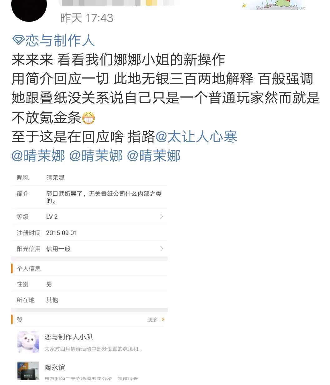 最后,就是昨天晚上,恋与公司的人事行政主管@晴茉娜 伪装成普通玩家帮游戏公司说话,结果被扒皮。