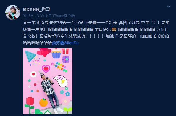 今年3月,梅雪在微博上祝苏醒35岁生日快乐,公开发了他的照片,算是半官宣了恋情。