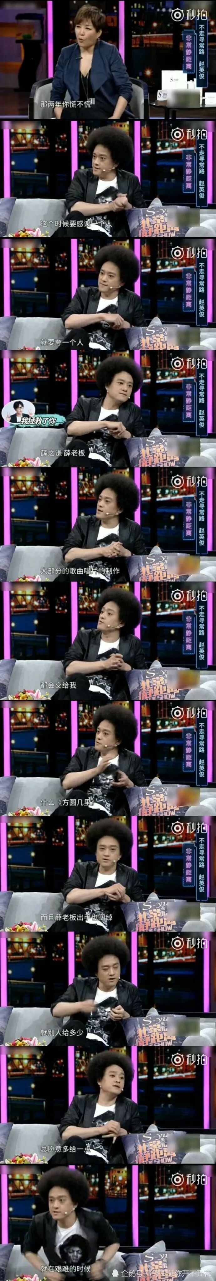 赵英俊在《非常静距离》说到自己最艰难的时刻:那时候要感谢一个人,就要夸一个人,薛之谦,薛老板,大部分唱片制作都会交给我,像什么《方圆几里》。而且薛老板出手也阔绰,别人给多少,总愿多给一些,在最困难的时刻。