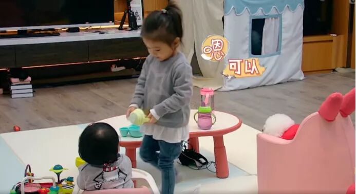 当修杰楷真的离开以后,咘咘也真的帮妈妈照顾妹妹,主动收拾已经用完的玩具。妹妹吃小饼干噎到了,咘咘不仅帮忙拿水,还记得在喂水之前帮妹妹试试水温。