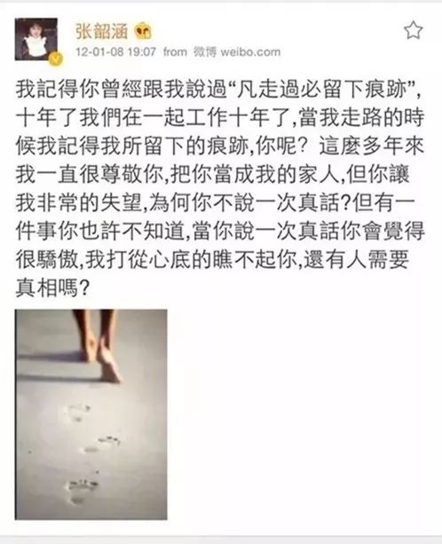 于是张韶涵也发了微博回应,说自己一直将他当家人,如今是“打心底里瞧不起你”。