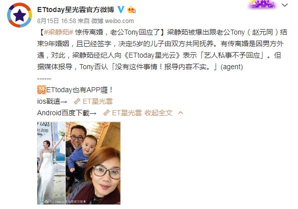 消息出来后,梁静茹的丈夫火速出来辟谣,称没有出轨,没有离婚,两个人只是婚内因小事吵架而已。