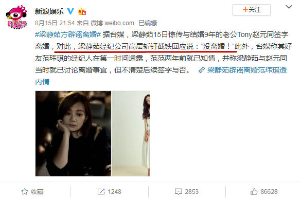 而梁静茹所在的公司高层直接否认了离婚一事。
