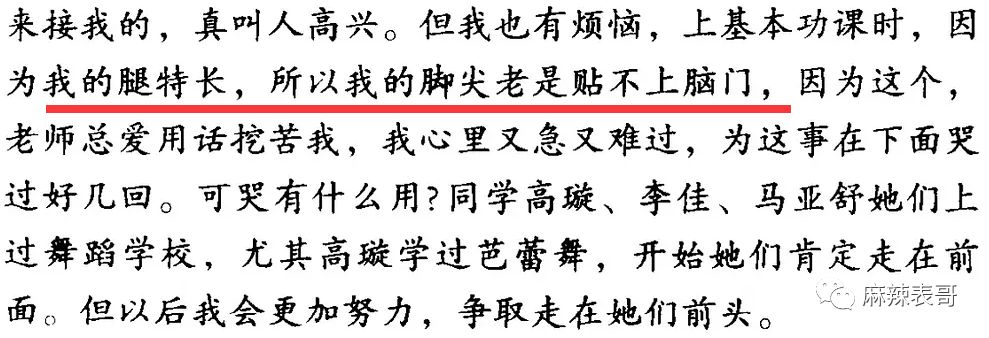 袁泉在信中透露因为腿太长而贴不上脑门,很苦恼,因为这,老师总爱挖苦她。