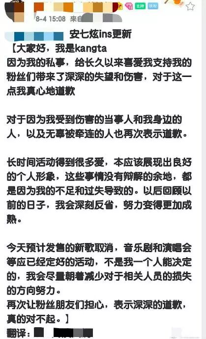 不过不承认,韩国明星在道歉和分手这方面,的确还挺快。8月4号,安七炫在个人社交平台上发文致歉,并表示会深刻反省。