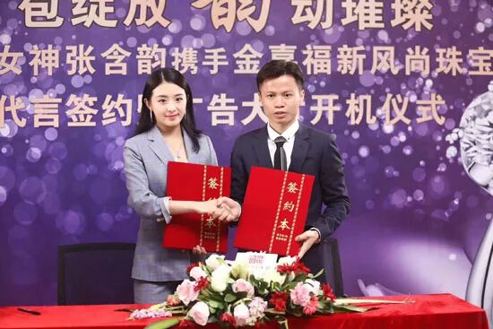 2018年2月,金嘉福珠宝聘请甜美女神张含韵担任品牌形象代言人签约仪式暨广告片开机仪式在深圳隆重举行。甜美女神张含韵邂逅金嘉福珠宝,青春活力阳光向上却不失优雅,温润美好令人心动。张含韵的甜美青春和实力底蕴与金嘉福珠宝的品牌文化完美契合,这场奇妙际遇令人惊喜。