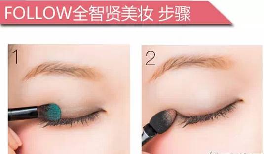 1. 先用眼影刷蘸取少量深绿色眼影,涂抹在眼皮褶皱处,注意力度要轻柔,范围不要太广。