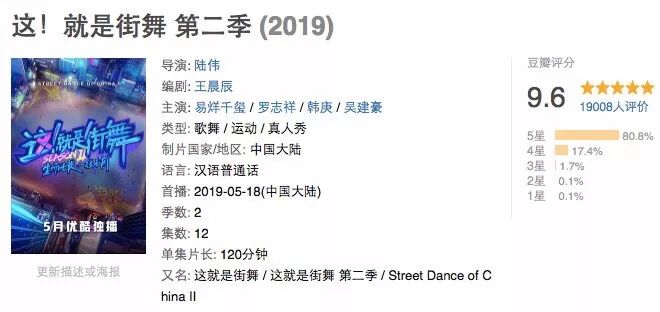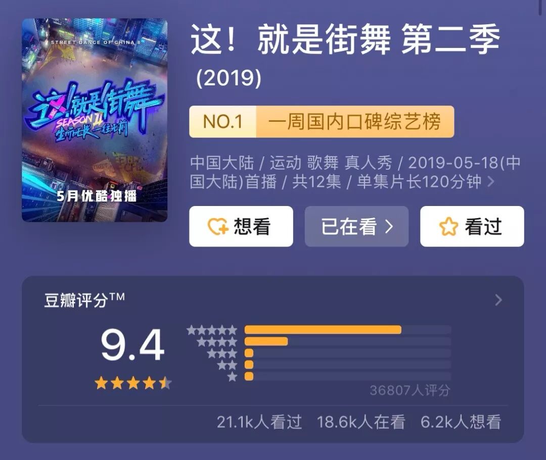 《这就是街舞2》强势回归,目前豆瓣高评9.4左右,一周内口碑综艺榜NO.1。超过3万人评价、超过75%的好评,堪称国内综艺的一匹黑马。