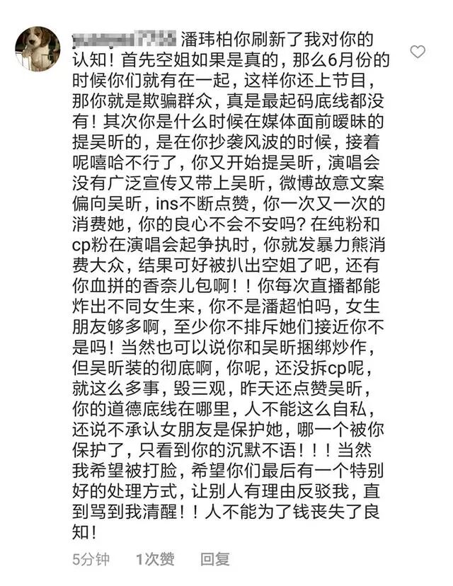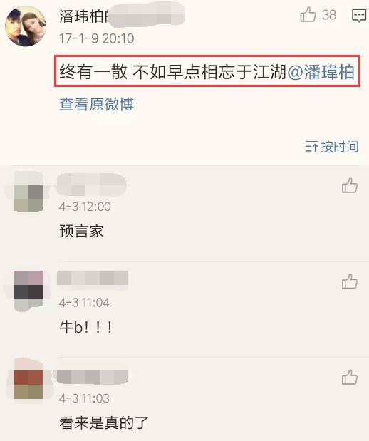 底下有一个号评论,“终有一散 不如早点相忘于江湖”,还@了潘玮柏。