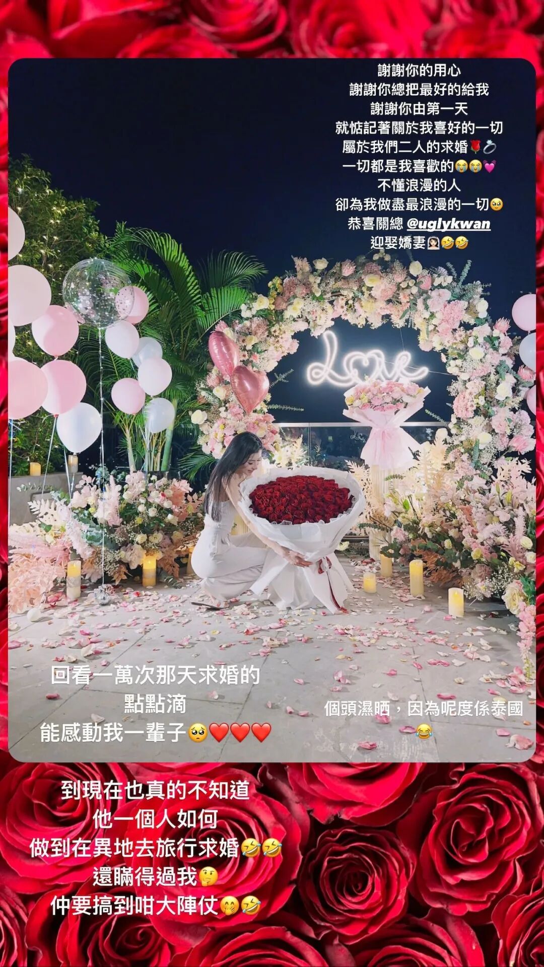 虽然两人拍拖不是秘密,但从未贴过合照,这次他就罕见在社交平台上晒出求婚合影及当日的花絮。