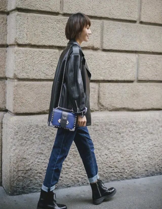 袁泉的这一身造型确实会显得比较的帅气,上半身穿的是一件黑色的皮革外套,而且背的包包感觉也是比较有特色,可以看到上面的图案颜色看起来都会显得比较的高级,下面穿的是一条牛仔的直筒裤,再搭配一双黑色的靴子真的是恰到好处。