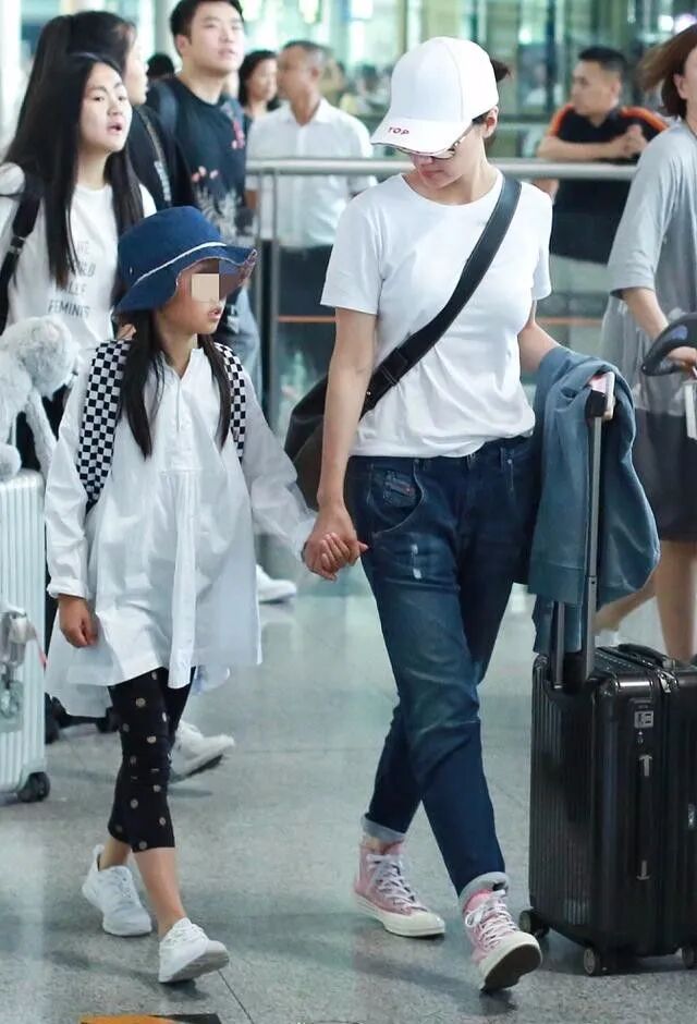 袁泉有的时候也会带着自己的女儿一同出现在机场,这个时候两个人上半身穿的都是白色的衣服,只不过袁泉身上穿的是一件短袖,而且这些短袖生命并没有其他图案加以修饰,下面穿的就是一条牛仔裤,只不过这条牛仔裤的颜色会稍微显得深一些,而且下面穿的是一双粉粉嫩嫩的高帮鞋。