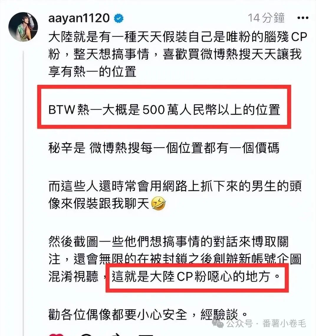 2月26日,炎亚纶在个人平台发表了一篇情绪激烈的帖子,直言对内地粉丝中的某些群体深感厌恶。他指责那些脑残粉无端制造虚假聊天记录,意图将他推上热搜的首位。炎亚纶甚至揭露了一个惊人的数字,据说热搜第一位的热度价值约五百万元人民币,且竞争激烈,最终由出价最高的粉丝或团队锁定。