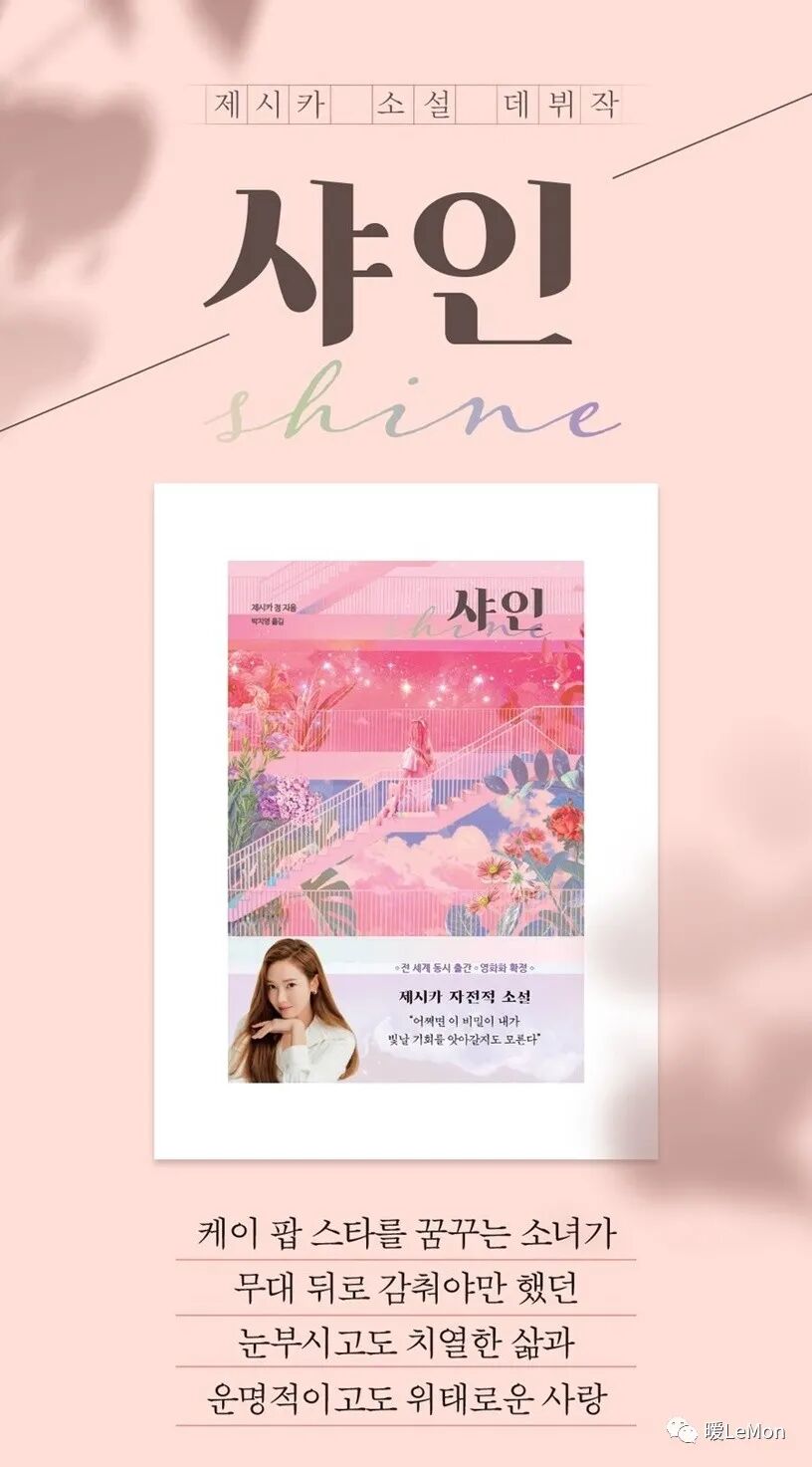 《Shine》是由Jessica的自身经历为灵感,而创作的半虚半实自传小说,出版社表示:「这是一本超级写实主义小说,融入作者长年在演艺圈中心的经历,包括作为KPOP歌手必须经过的漫长练习生活、众人冷酷评价、严格的规则、没完没了的猜忌和嫉妒、秘密的舆论操作,以及只有女性才会受到的不当待遇等等,现实的笔触相当有代入感。」