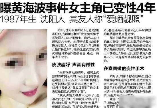 黄海波嫖娼后,事件的女主角也随之被曝光。据媒体爆料,黄海波嫖娼事件主角刘馨予系沈阳人,1987年出生,在泰国做的变性手术,至黄海波嫖娼时,变性已有4年,但做女性打扮已9年。