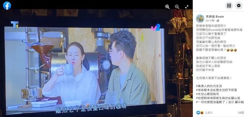 曾志伟确诊新冠!曾宝仪透露病况好转:已经可以聊天看电视了 我爱追港剧 港台女星 2022-08-25 22:34:59 994 创作不易,用心坚持,欢迎请BaGua喝几杯爱心咖啡!打赏并支持本文 打赏并删除本文 “奖门人”曾志伟日前确诊,因而缺席《开心无敌奖门人》录制,据报道指他声音沙哑,现正隔离中。曾志伟早前发出声明指仅属小毛病,并非传闻中严重,由于他每天开会接触很多人,确诊也在意料之中,现正在家处理公司事务。曾志伟女儿曾宝仪昨日在Facebook透露父亲近况,她表示父亲在家收看其主持的节目,更拍下照片发送给她,曾宝仪表示:很明显他的症状慢慢减缓恢复,已经可以聊天看电视了。看见父亲病中仍然关心自己,令曾宝仪颇为感动。曾宝仪更与曾志伟分享“过来人”经验,她说:我也以过来人的经验跟他说,染疫就平常心面对,好好躺平休息。另外,曾宝仪对曾志伟拍下她闭眼的照片感到哭笑不得,她幽默道:爸爸根本没在管女儿好不好看,女儿心里很无奈,但想到爸爸即使生病也在关心我,一切也都云淡风轻了! 创作不易,用心坚持,欢迎请BaGua喝几杯爱心咖啡!打赏并支持本文 打赏并删除本文 感谢您的支持鼓励,我会继续努力的!文章地址:用户邮箱:打赏金额:USDT 请输入数字点击”去打赏“,即可进行打赏支持本文章哦 曾宝仪 About the Author 我爱追港剧 功能介绍:原名:我爱追TVB!继续关注我哦! 关注TVB明星动态,剧集资讯,五十万TVB忠实粉丝都在关注哦,就差你啦 Related Posts 陈自瑶内地带货首秀!被问老公有没有鼓励!即回应:哪个? 2023-03-29 23:04:17 陈浩民惊传离婚结束11年婚姻关系!太太拍片亲自回应揭真相 2022-10-05 22:46:06 曾志伟确诊新冠!曾宝仪透露病况好转:已经可以聊天看电视了 2022-08-25 22:34:59 郭可盈12岁女儿首次开直播!自爆会看妈妈TVB经典剧集 2022-06-22 22:38:42 杨丞琳唱《使徒行者》片尾曲《越难越爱》,原唱吴若希转发支持 2022-06-12 22:55:17 发表评论