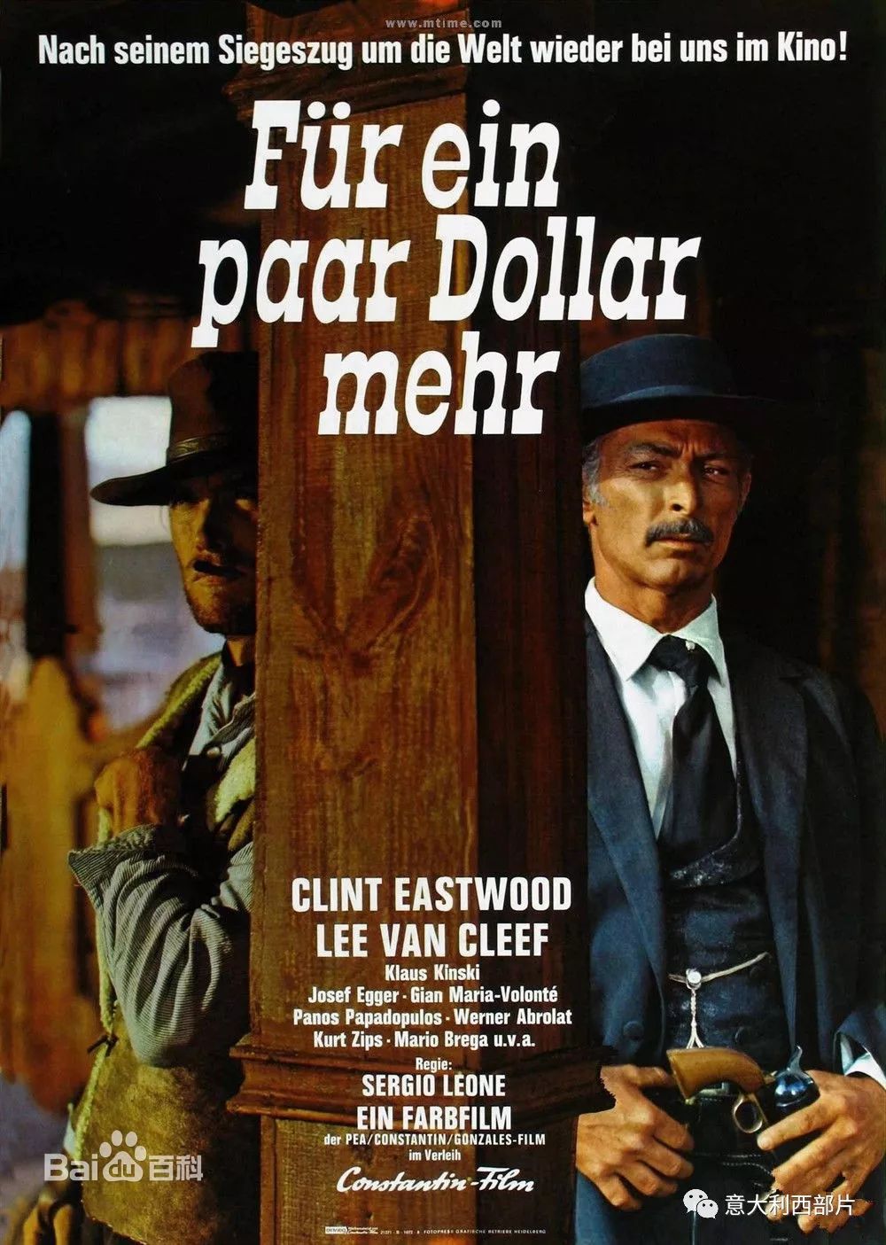 《荒野大镖客》成功后,制片人投资的西部片越来越多,预算也越来越高。Leone很快在1965年推出续集《黄昏双镖客》(For a Few Dollars More),这一次由Eastwood和一个好莱坞退休的配角演员李*文*克里夫Lee Van Cleef出演一对互相竞争的赏金猎人,他们追逐同一个疯狂杀手。这部电影的成功巩固了Leone西部片大导演的身份,也让Eastwood,Van Cleef和配曲家Morricone一跃成为国际明星。