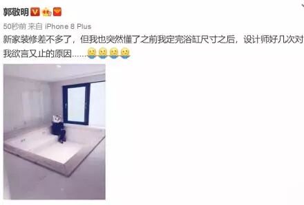 1月29日,郭敬明在微博中晒出一张新家的照片,并写道:“新家装修差不多了,但我也突然懂了之前我定完浴缸尺寸之后,设计师好几次对我欲言又止的原因……”照片中,郭敬明端端正正地坐在新家的浴缸里,而浴缸的面积大的有些夸张,装下10多个人都绰绰有余,怪不得有人调侃:“这哪儿是浴缸啊,这是操场吧!”