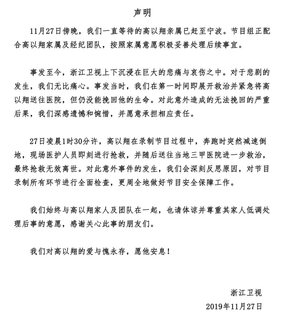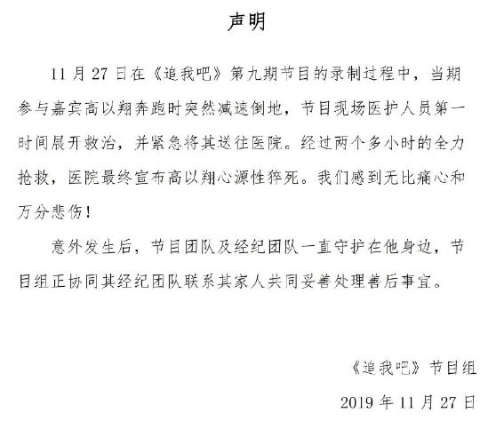 27日,《追我吧》节目组发布声明,宣布高以翔经过全力抢救,最终遗憾的宣布高以翔心源性猝死。