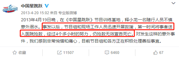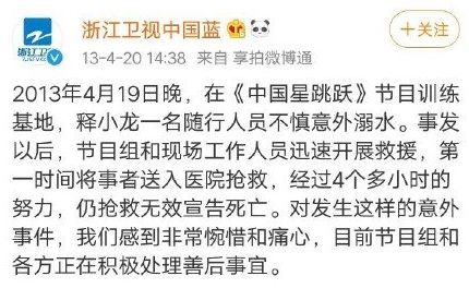 这已经不是浙江台第一次出现这样的情况,2013年,释小龙的助理不慎意外溺水身亡。