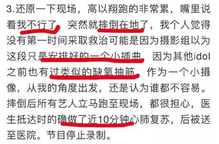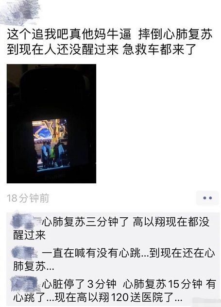 还有疑似现场观众爆料,高以翔在现场心脏停跳了三分钟,有人一直在喊没心跳了,心肺复苏做了十几分钟,都没有苏醒。