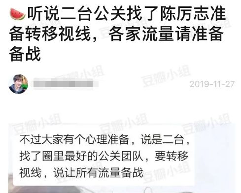 网上有瓜说,电视台为了转移视线,找了圈内出了名的公关人陈砺志洗地,还请各家流量时刻小心,被拉出来挡枪。