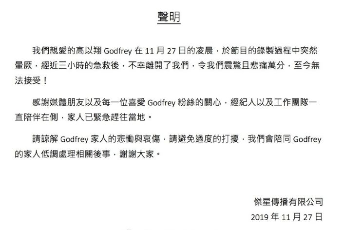 高以翔所在的经纪公司,发布讣告,沉重的表达了悲痛。