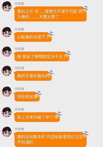 钟楚曦爆料,她录制了两期就受不了,坚决不去了。