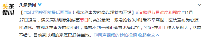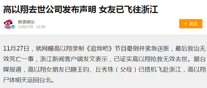 11月27日凌晨,高以翔在宁波录制《追我吧》节目过程中,猝然倒地昏厥,经过了近3个小时的急救,没能救回来。