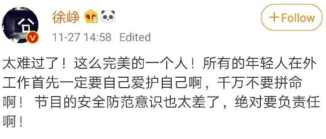 徐峥在微博上斥责节目组,安全防范意识太差,绝对要负责任!