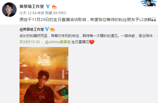 高以翔猝死后,一同录制的黄景瑜,取消了两天后的生日直播活动。