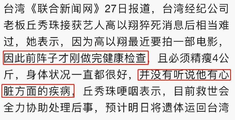 高以翔公司的老板说,高以翔前段时间刚刚做完健康检查,身体状况很好,而且没有听说有心脏方面的疾病。