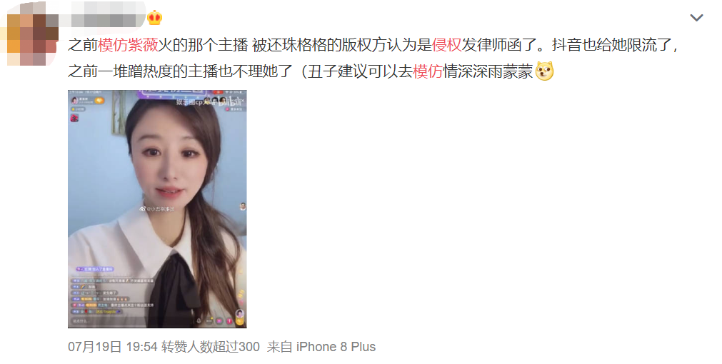 碰瓷杨幂!差点被封杀,想钱想疯了? 美美娱乐 内地女星 2021-08-19 12:50:24 1046 创作不易,用心坚持,欢迎请BaGua喝几杯爱心咖啡!打赏并支持本文 打赏并删除本文 最近好多小伙伴说没有及时收到阿美的推送,记得把阿美设为星标哦,我们每天中午准时见~近日,在短视频平台上,有个“幂姐”突然火了。看评论区还真以为是杨幂本人开了个号呢!其实这条视频的作者名叫:三梦奇缘,原本是分享自己的生活日常。点赞与评论她的作品的人大多是朋友亲戚,且数量极少。那么为什么这么多人叫她幂姐呢?毕竟在大家眼里,杨幂是长这样的:这要从下面这条视频说起,本来内容平平无奇,因为被网友发现其角度与杨幂方脸时期的照片有些相似,从此她和“幂姐”这两个字分不开了。自从这条评论火了后,三梦奇缘的每条视频都涌入无数喊“幂姐”的粉丝,甚至还创造出许多衍生梗。有人发现在她抖音下评论“幂姐”,就会有人说“谢谢”。甚至还有杨幂、杨幕、杨冥乱入……网友们的小把戏可真多以及网友百看不厌的排列组合梗和各种表情包。好事者还找出杨幂当年所拍的洗发水广告与其对比。百度识图也跟着来凑热闹,识别她的照片,相关联的居然是杨幂。从此以后,三梦奇缘的所有动态的评论似乎都会出现与杨幂有关的内容,把她的配偶称为刘恺威,将其孩子叫小糯米。三梦奇缘像是掌握了财富密码一般,不仅主动发抖音称自己与杨幂十分相似。还在直播间中唱爱的供养,cue杨幂相关不雅ID,导致直播间多次被封。但即使这样,依旧有大批粉丝愿意看她直播,在她动态下抖机灵,许多大网红也愿意与她连麦PK吸引热度。方脸时期的照片频繁被翻出来以及各种评论吐槽,必然对杨幂本人会带来相关影响。甚至微博上出现:杨幂最想除掉的人是三梦奇缘、三梦奇缘美过杨幂本尊之类的调侃言论。混迹内娱多年幂粉们,立刻对这位不速之客作出反应。除了日常微博广场巡逻外,还将其超话给炸了,粉丝中有号召举报的。有粉丝辱骂其蹭热度无底线。还有看热闹不嫌事儿大的路人,嫌弃杨幂粉丝没有格局的。与此同时,三梦奇缘本人也被扒皮出反同言论!导致本来就是她的主要受众群也对其出现动摇。本以为三梦奇缘经历这些打击后,数据肯定不如从前。但最近她又开直播与多位粉丝合唱《爱的供养》,反映很不错,短视频平台属实是让她玩儿明白了!但可能是为了害怕被正主告,或者迫于幂粉的压力,三梦奇缘在粉丝群里喊话,不准把名字改成杨幂、刘恺威、魏大勋相关的,否则就会被移出群。如今,有许多因长相与名人极为相似而获得特殊关注的网红。比如打扮后长相酷似紫薇的网红,被榜一大哥刷的礼物治好失明的剧情还登上了微博热搜,甚至王思聪也来她直播间刷礼物。还和“山寨小燕子”梦幻连麦,不仅吸引来一大波流量,还成为了营销号们的素材。还有同样上过热搜的“南宁罗志祥”,但自从罗志祥出事后,这位“撞脸明星”直播中,被“渣男”刷屏。最搞笑的是,当属与黄子韬撞脸的黄子城,可以看出来很用心在找角度了。还与几位撞脸网红组成了团体ESO,实属把人给看笑了。还有这个“山寨张翰”,恐怕张翰本人看了都要愣三秒,实在太像了!不笑像,笑起来,更像!而这种依靠特殊外貌获得关注的现象俨然已经成为一条打造网红的产业链。凭借特殊的外表获得关注固然是一种能力,但如何让这种关注持续下去更多靠得就是个人的本事了。不然不仅热度难以维持,甚至引导粉丝走上弯路。重见光明的“夏紫薇”因为见钱眼开,被中新网评价“不如瞎着”。而且利用这些牟取利益,会避免不了法律问题,比如剧方的版权以及林心如的肖像权,追究起来都是侵权。“山寨林俊杰”范一闲,从只敢碰瓷林俊杰的名气,到公然打着林俊杰的招牌,开粉丝见面会,接商演和广告,疯狂捞金几百万。因为海报上根本不会标注是模仿者,很多观众都会被误导,以为是林俊杰本人来了。连韩红都看不下去了,忍不住站出来骂他。最终,被林俊杰方控诉,得到法律的制裁。最后再回归到三梦奇缘本人,观察她以前的作品不难看出她也只是千千万万抖音用户中的一个。在她以前的作品中,会有陪孩子家人吃饭的温馨场景。会有夫妻二人的真情流露。能看到为生活奔波的疲惫同时又有积极生活的态度。因为孩子取得好成绩的家庭盛宴。但现在更多是为了“幂姐”这一标签符号,而做出的哗众取宠的动作与内容。或许与名人光环沾上边让他们感受到精神与物质方面的满足,但没有真才实学,也只不过是一场短暂的网络狂欢,热度一过,便只剩下虚无与极大的落差感。阿美想说:同时,也希望撞脸网红明确自身定位,合理利用自身外貌优势,不做假冒明星身份行不法之事,否则“撞脸”终“撞祸”。(部分配图来源网络,如有侵权邮件联系[email protected])—————推荐阅读————— 瞒不住了!承认被包养,老公还出轨闺蜜?妈呀!神仙夫妻不生娃,节目上公开离婚!锤了?!花900w设计分手,刚见完家长就掰?真离了!背着3个孩子偷腥,还装恩爱捞金? 创作不易,用心坚持,欢迎请BaGua喝几杯爱心咖啡!打赏并支持本文 打赏并删除本文 感谢您的支持鼓励,我会继续努力的!文章地址:用户邮箱:打赏金额:USDT 请输入数字点击”去打赏“,即可进行打赏支持本文章哦 杨幂 About the Author 美美娱乐 功能介绍:跟着阿美走,快乐天天有 Related Posts 迪丽热