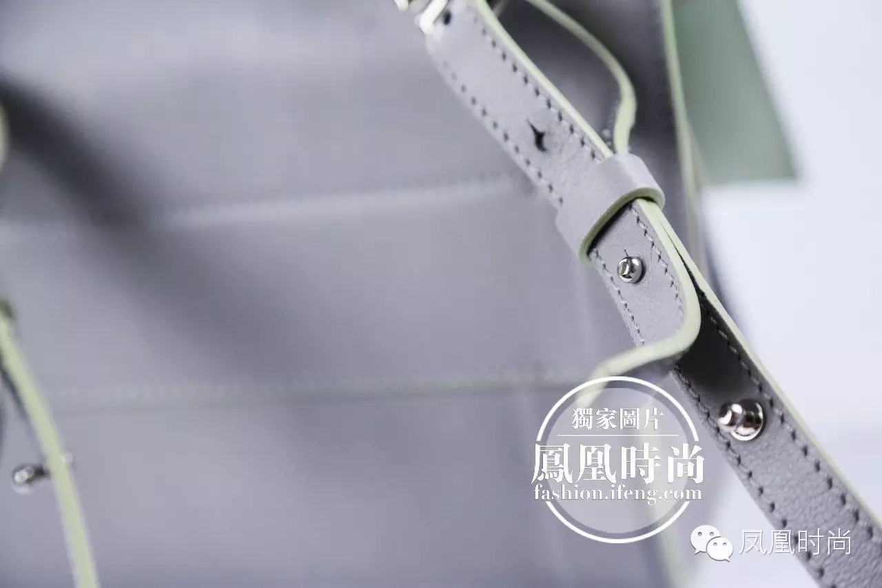 结论:背面缝线和皮面拼接,金属扣和肩带也是位于包包的背面。