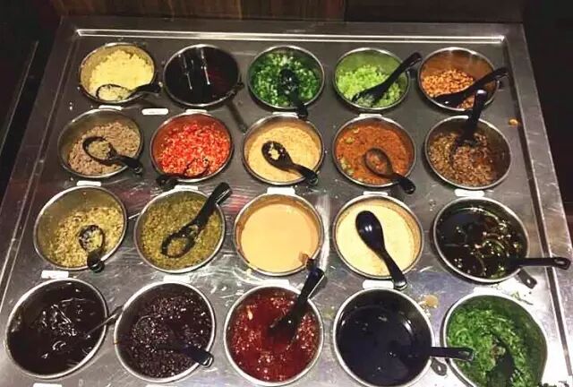 还有超丰富的蘸料,各种口味,任君选择~