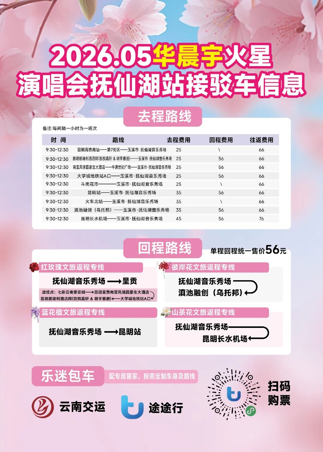 为给华晨宇火星演唱会粉丝带来优质的出游体验,昆明文旅在“五一”期间推出了“五一到昆明 看花花 游绿道 追滇风”主题攻略,并推出了昆明长水机场、昆明高铁南站、昆明站、斗南花市、火车北站、滇池融创(乌托邦)、南亚风情豪生大酒店等多条线路至华晨宇火星演唱会抚仙湖站接驳专线,粉丝们在听演唱会期间,可以在昆明住宿、赏花、打卡滇池绿道美景,通过“途途行”小程序购买接驳车票,便捷前往演唱会现场。
