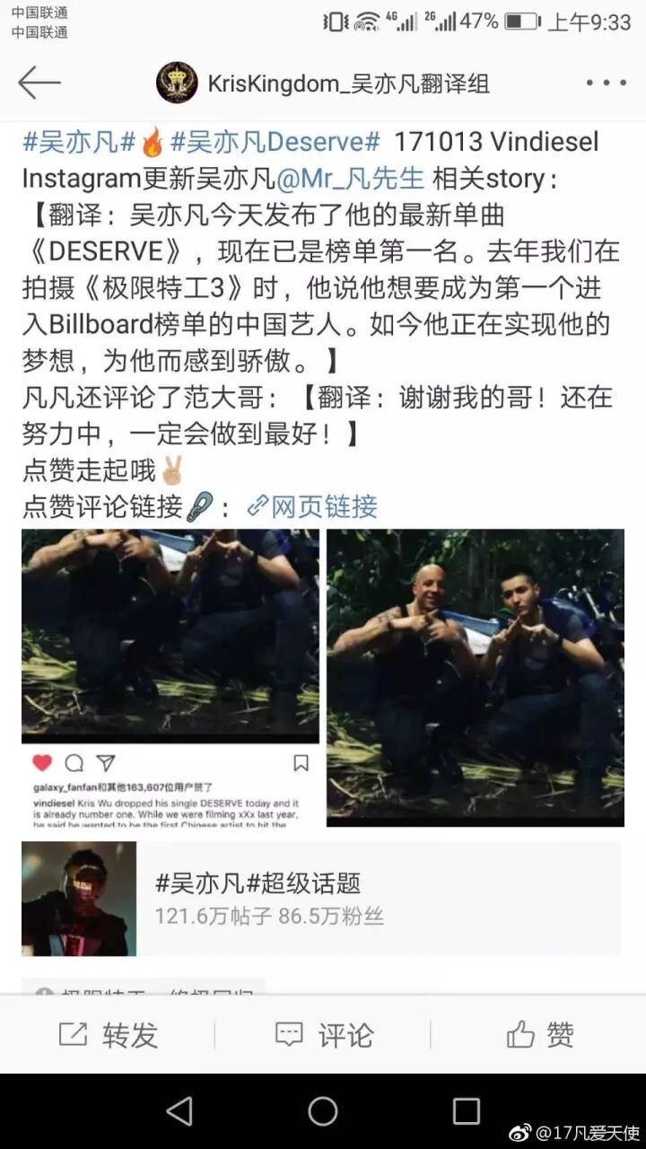 新歌《Deserve》取得傲人的成绩,范老大也在第一时间向好兄弟发去了祝贺。